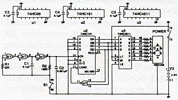 A roleta digital roda com velocidade alta (50Hz). Qual é o número no display? Parece com o número 8, certo? Na realidade, os números de 0 -- 9 aparecem em ordem muito rápido. Pressione S1, e o display pára em um número.