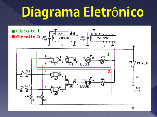 O teorema De Morgan diz que o circuito da porta (U1) para o LED 1 e circuito da porta (U2) para o LED 2 são logicamente iguais. Vamos verificar isto ligando a chave de alimentação (ON) depois de fazer as conexões deste projeto. Use S1 e S2 para ver que os estados (aceso / apagado) dos LEDs 1 e 2 são exatamente iguais. O teorema De Morgan também menciona a seguinte fórmula: