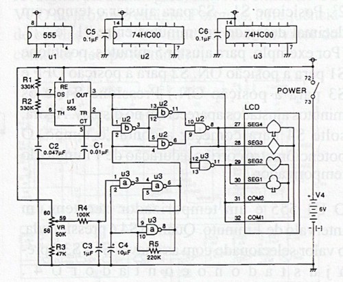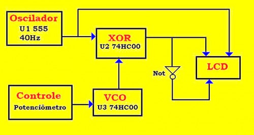 O LCD deve sempre ser alimentado com corrente alternada porque corrente direta pode deteriorar as características do LCD. O U1 555 está oscilando a uma frequência para drenagem estática. Por outro lado, o VCO U3 "a" está oscilando a uma frequência que depende da tensão de entrada do potenciômetro e é maior que a frequência de U1. O circuito de OR exclusivo (XOR) U2 "b" ajusta o sinal do segmento para a fase oposta (para o segmento habilitado) ou mesma fase (segmento desabilitado) com relação ao comum. Quando o potenciômetro é girado o VCO recebe uma tensão maior e portanto aumenta a frequência de oscilação, o LCD não consegue responder a esta frequência.