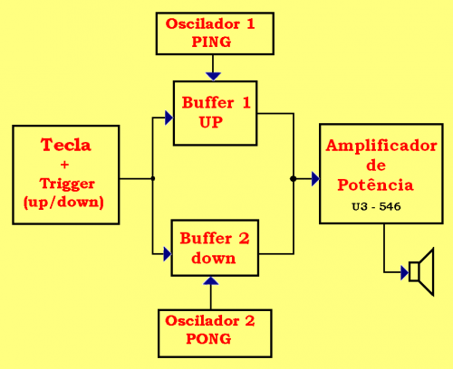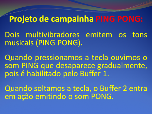 Após finalizar as ligações deste projeto, alimente o circuito e, após aproximadamente 3 segundos, pressione S1. Com o aperto de S1, um pulso de gatilho é aplicado à base de Q4. Enquanto C6 é gradualmente descarregado, o som "ping" de U1 "b" passa através dos "buffers" Q3 e C6 é gradualmente descarregado, o som "ping" de U1 "b" passa através dos buffers Q3 e Q6, e então através de U3, antes de ser emitido pelo alto-falante. Um processo similar ocorre para o som "pong" quando S1 é solto.