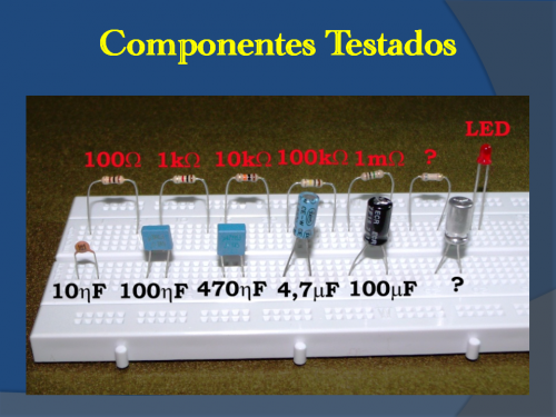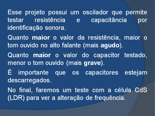 Este projeto utiliza um CI como um oscilador, e permite a você testar resistência e capacitância. Valores iguais de resistência e capacitância produzem o mesmo tom no alto falante.