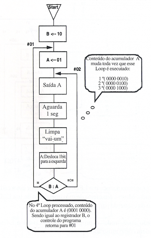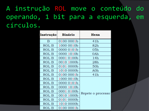 ROL é uma instrução interessante e única. Ele move o conteúdo do operando 1 bit para a esquerda. Neste programa, o estado inicial do acumulador A é (0000 0001). Quando o programa é executado, a instrução ROL na linha 05 desloca o operando (0000 0001) um bit para a esquerda, o que resulta em (0000 00010). Em outras palavras, o conteúdo do operando move-se em círculos para a esquerda.
