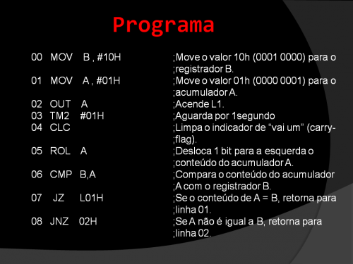 Este programa acende um LED, L1 a L4 um por um a cada segundo. Mostra um efeito de movimentação de um LED aceso da direita para a esquerda.