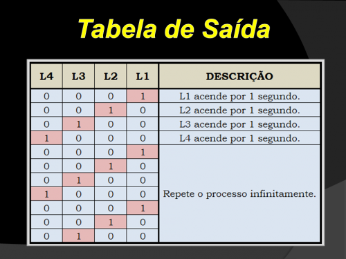 Quando você “roda” o programa, os LEDs L1 a L4 se acendem como mostrado abaixo: