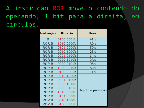 ROL é uma instrução interessante e única. Ele move o conteúdo do operando 1 bit para a direita. Neste programa, o estado inicial do acumulador A é (0000 1000). Quando o programa é executado, a instrução ROL na linha 05 desloca o operando (0000 1000) um bit para a direita, o que resulta em (0000 0100). Em outras palavras, o conteúdo do operando move-se em círculos para a direita.
