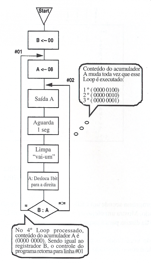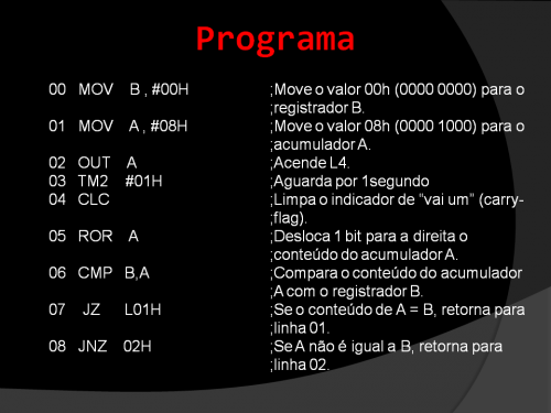 Este programa acende um LED, L4 a L1 um por cada segundo. Mostra um efeito de movimentação de um LED aceso da esquerda para a direita.