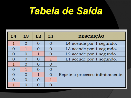 Quando você “roda” o programa, os LEDs L1 a L4 se acendem como mostrado abaixo: