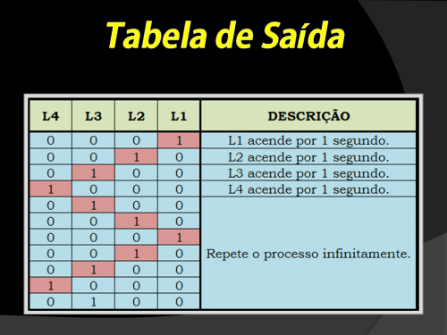Quando você “roda” o programa, os LEDs L1 a L4 se acendem como mostrado abaixo:
