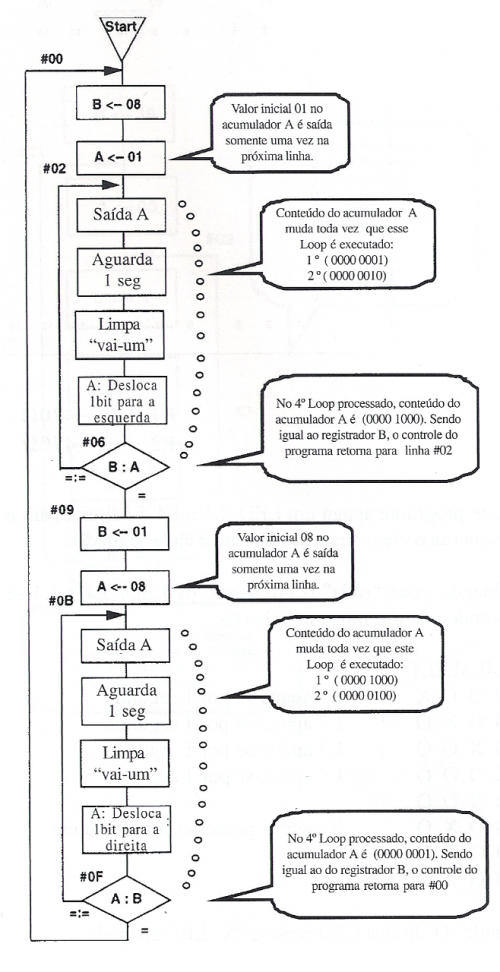 Neste programa e naqueles dos projetos 408 e 409, qual é a tarefa do registrador B? Seu valor não muda enquanto o programa “roda” e é apenas comparado com o conteúdo do acumulador A. O registrador B atua como um dispositivo de parada ou um limitador de tarefa, já que ele modifica o fluxo do programa com as instruções CMP e JZ/JNZ subseqüentes.