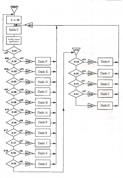 Agora, veja os códigos de programa. Com as linhas #00 a #04, o programa inicialmente envia para a saída o valor 00 e obtém sua entrada de dados das teclas. Com as linhas #05 e #07, se sua entrada por teclas for maior que 0F, o fluxo do programa retorna para o início (você pode imaginar um caso?). Começando na linha #05 estão os códigos correspondentes à série de blocos de decisão no fluxograma.