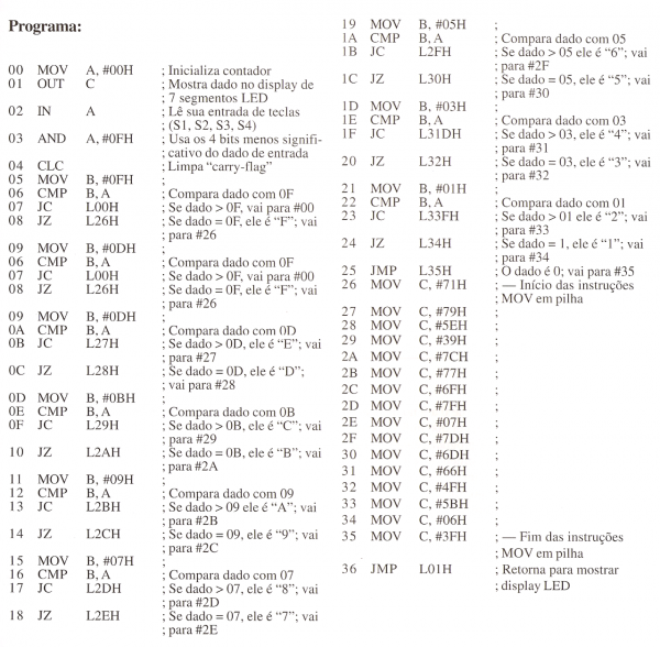 Você pode facilmente achar que o valor da entrada de teclas está dentro da faixa de 00 até 0F. É o ponto inicial para entender esta técnica de programação. Agora, com as linhas #05 e #06, o programa compara o valor da entrada de teclas com um valor constante 0F. É claro que desta vez o valor da entrada de teclas em questão é desconhecido. Primeiro o programa verifica se o valor da entrada de teclas é maior que 0F em #07. Se for, o valor é diferente do esperado e o fluxo do programa retorna para #00. Como você vai ver mais tarde, este código é destinado para uso numa situação muito especial. Vamos assumir que o valor da entrada de teclas não encontra esta condição e o fluxo do programa vai para #08. Com a linha #08, o programa verifica se o valor da entrada de teclas é igual a 0F. Se for, ele entende que você configurou todas as chaves de S1 a S4 para a posição acionada (1111 em binário). Neste caso, o programa vai para a linha #26 para usar o dado “F”.