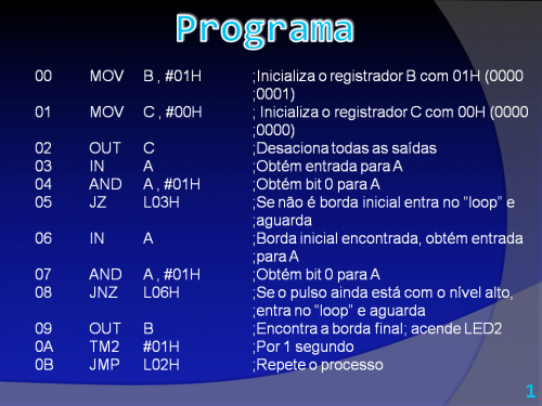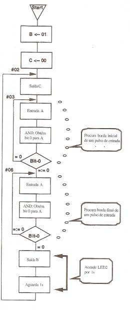 Vamos observar o fluxograma. O programa tenta capturar a borda inicial de um pulso que chega nas linhas #03, #04 e #05. Uma vez encontrada, o programa tenta capturar a borda final. Com esta combinação com uma parte lógica de programação, você pode obter a borda final de qualquer pulso exata e precisamente. O processo que se segue pode ser variado; você pode criar sua própria aplicação cuja ação é disparada exatamente com a borda final de um pulso que chega.