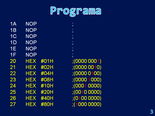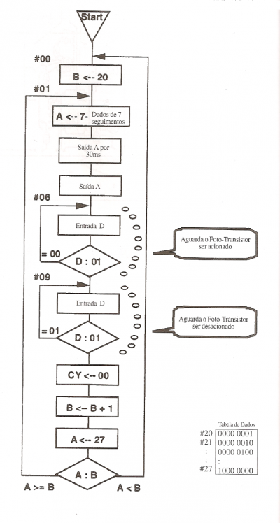 Agora, vamos observar o processamento total no fluxograma. O programa obtém primeiro o valor inicial de contagem 20H em #00. Entra no processamento de “loop” continua até que sua contagem atinja 28H. Uma vez que o valor da contagem inicial é 20H em #00. Entra então no processamento de “loop” que inclui os códigos de percepção dos seus dedos descrita acima. O processamento do “loop” continua até que sua contagem atinja 28H. Uma vez que o valor da contagem inicial é 20H, este “loop” se repete 8 vezes por ciclo Isto acontece também porque a tabela de dados de saída começando no endereço 20H contem 8 padrões de iluminação.