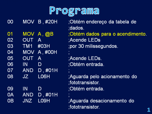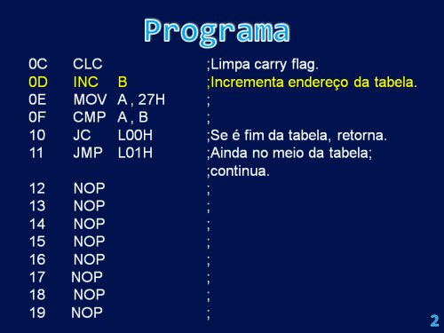 A chave para entender este programa é como começar a iluminação pelo movimento da ponta dos seus dedos sobre o fototransistor. Você pode ver uma solução para isso; os códigos de programa de #06 a #08 e de #09 a #0B são aqueles que você já viu em vários Projetos anteriores. O código #06 a #08 captura o dado de entrada 01, isto é, o processamento deste curto “loop” detecta a sua ação de cobrir o fototransistor com seus dedos. Então vem o 2º “gatilho”, de #09 a #0B, onde o programa aguarda você parar de cobrir o fototransistor com seus dedos.