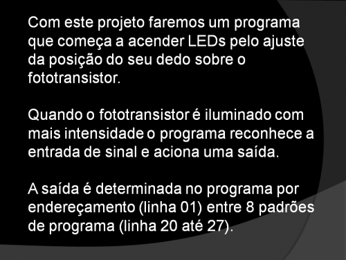 Com este projeto faremos um programa que começa a acender LEDs pelo ajuste da posição do seu dedo sobre o fototransistor.