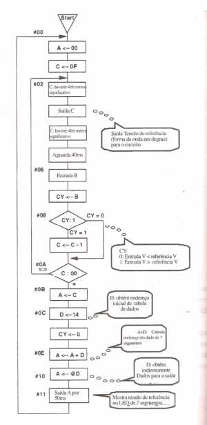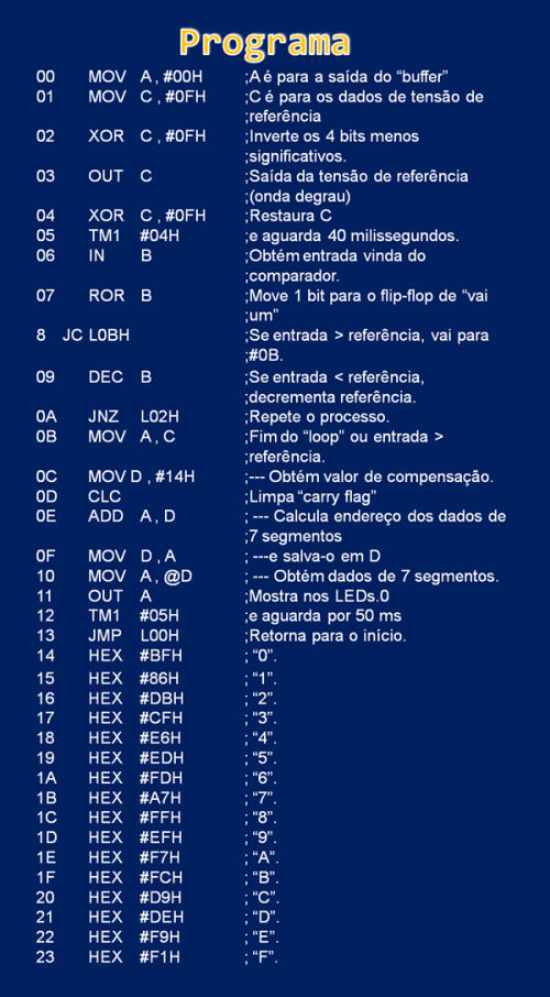 O ponto chave deste programa é a instrução MOV A, @D em #10. É nova para nós e necessita de algumas explicações. Neste ponto do programa, o registrado D contém os dados da tensão de referência mais 14H.